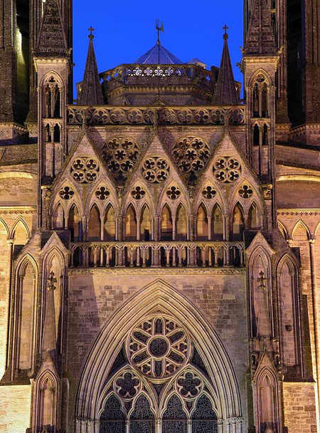 égaye un peu la sévère harmonie des lignes verticales. Six arcs principaux encadrant deux baies géminées sont eux-mêmes réunis deux par deux sous trois grands gâbles. Les tympans des arcs et des